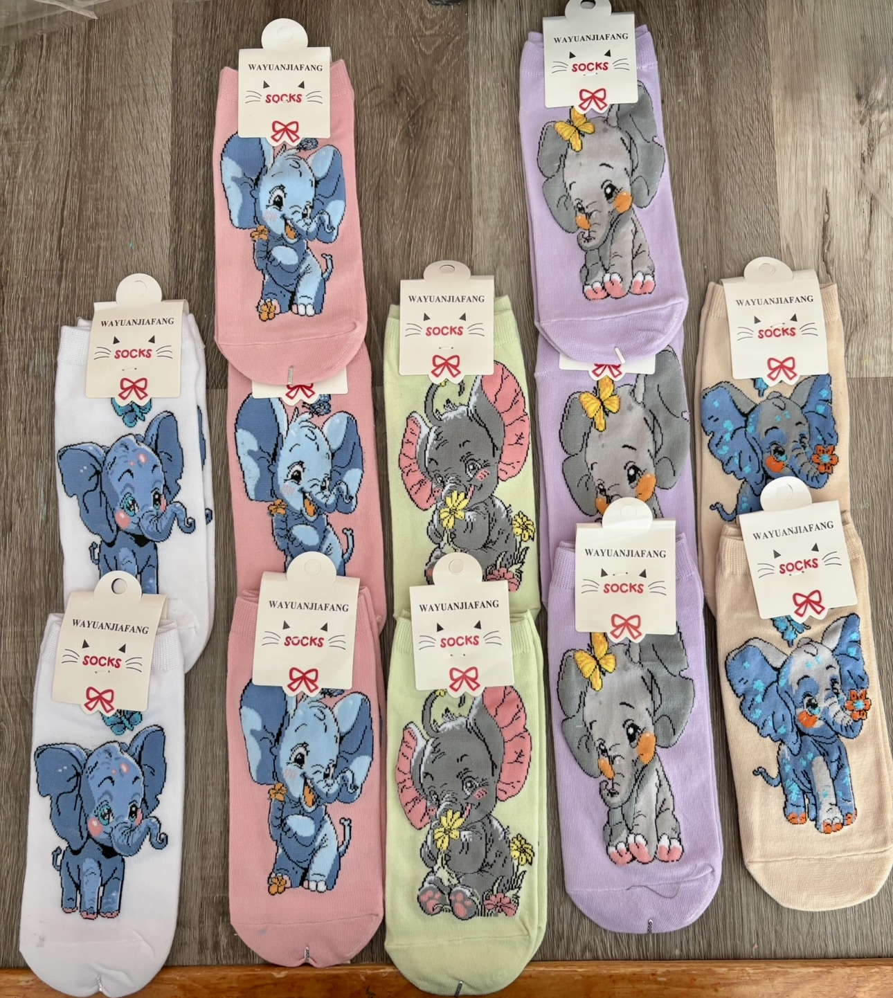 Design: Features a sitting grey elephant with large pink ears, holding a yellow flower. Designs vary.