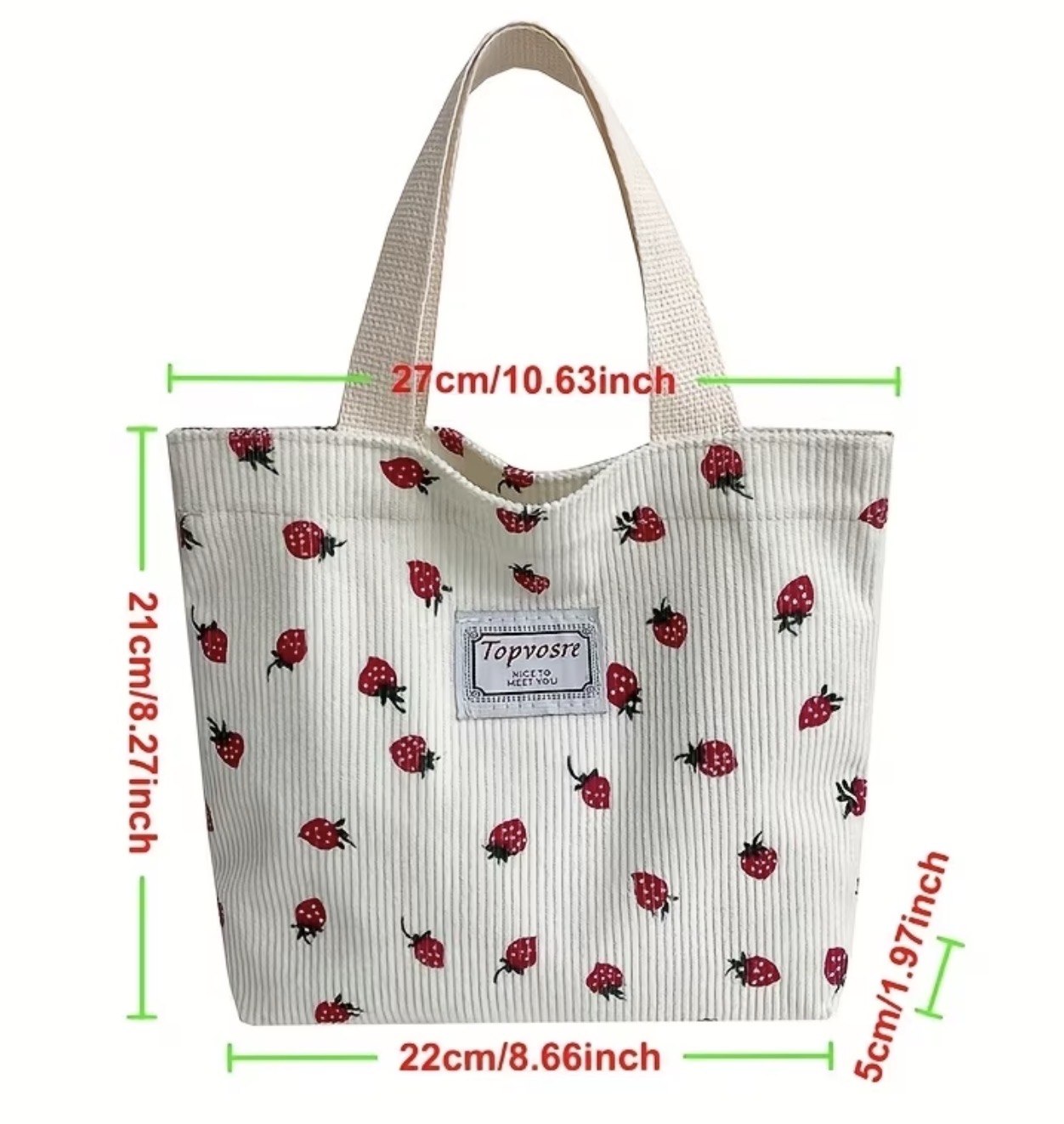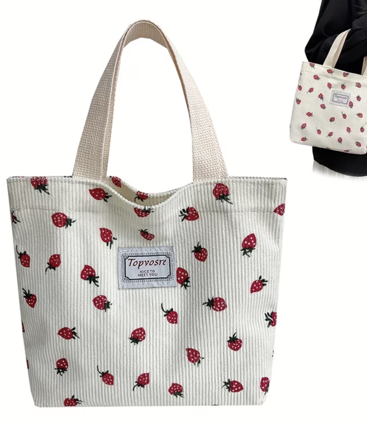 Foldable Women's handbag, tote bag, unlined, corduroy fabric, convenient storage, strawberry print, suitable for casual shopping, vacation commuting or street, holiday gifts