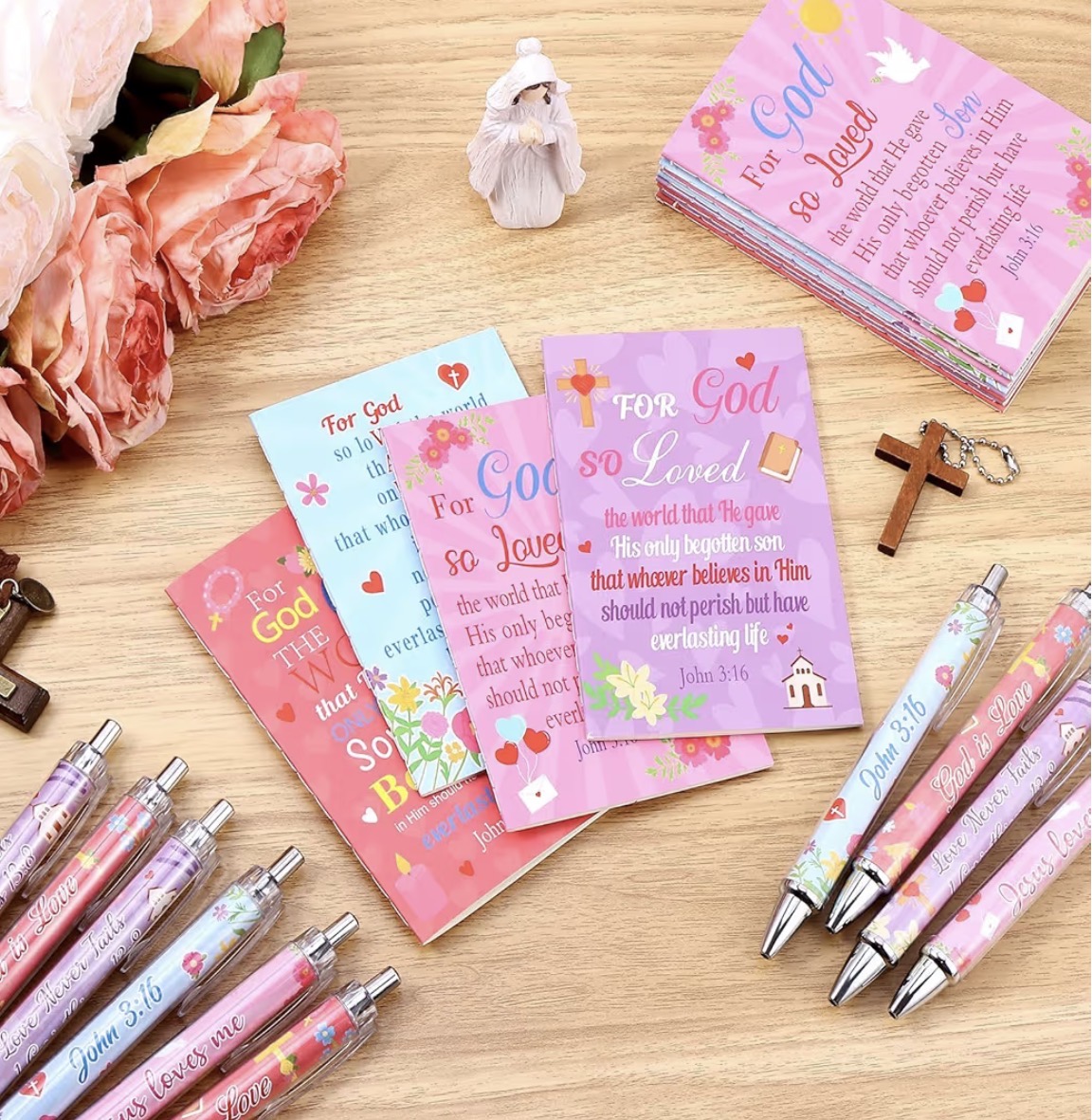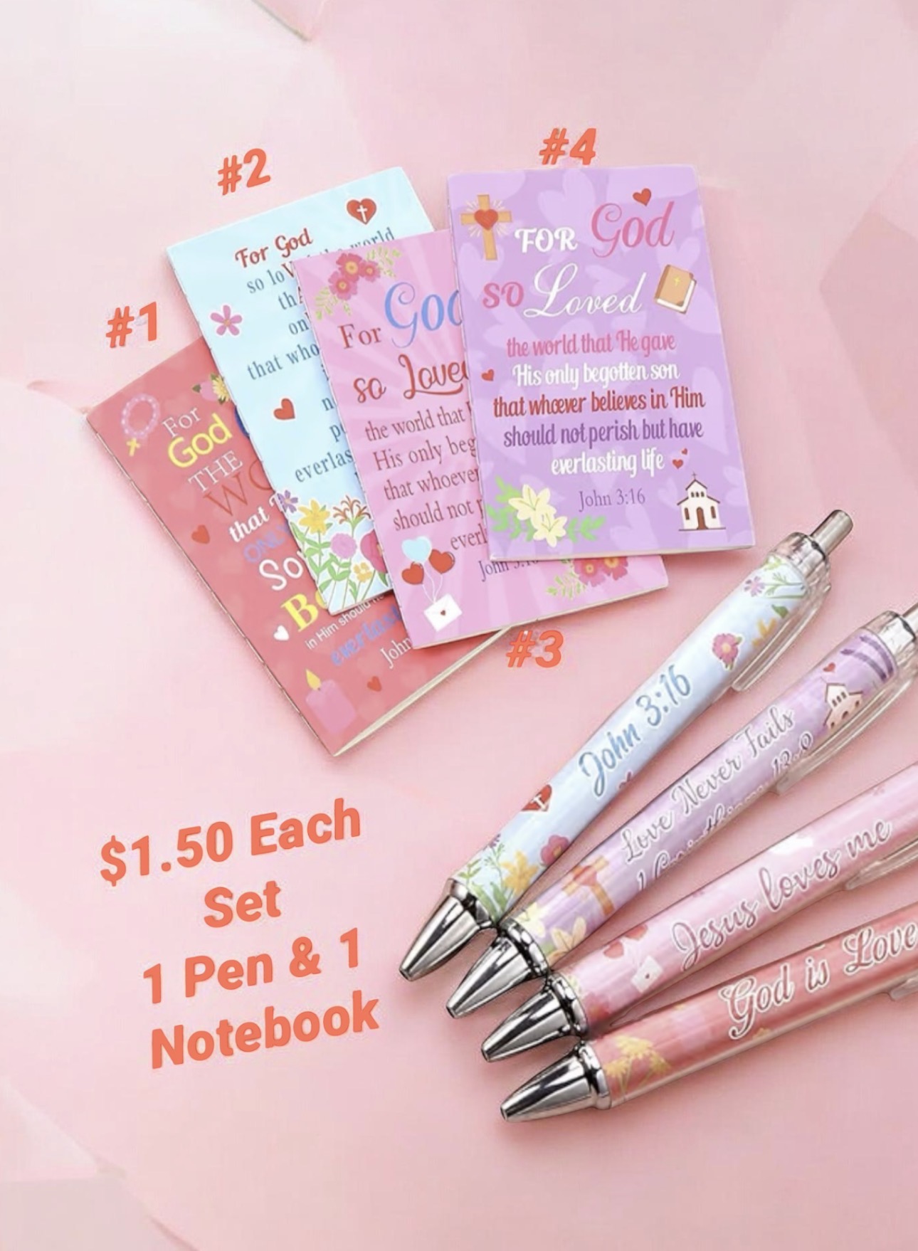 2pcs Bible scripture Pen and Notepad featuring the verseJohn 3:16. These colorful, themed notepads are often used for encouragement, and or as gifts.