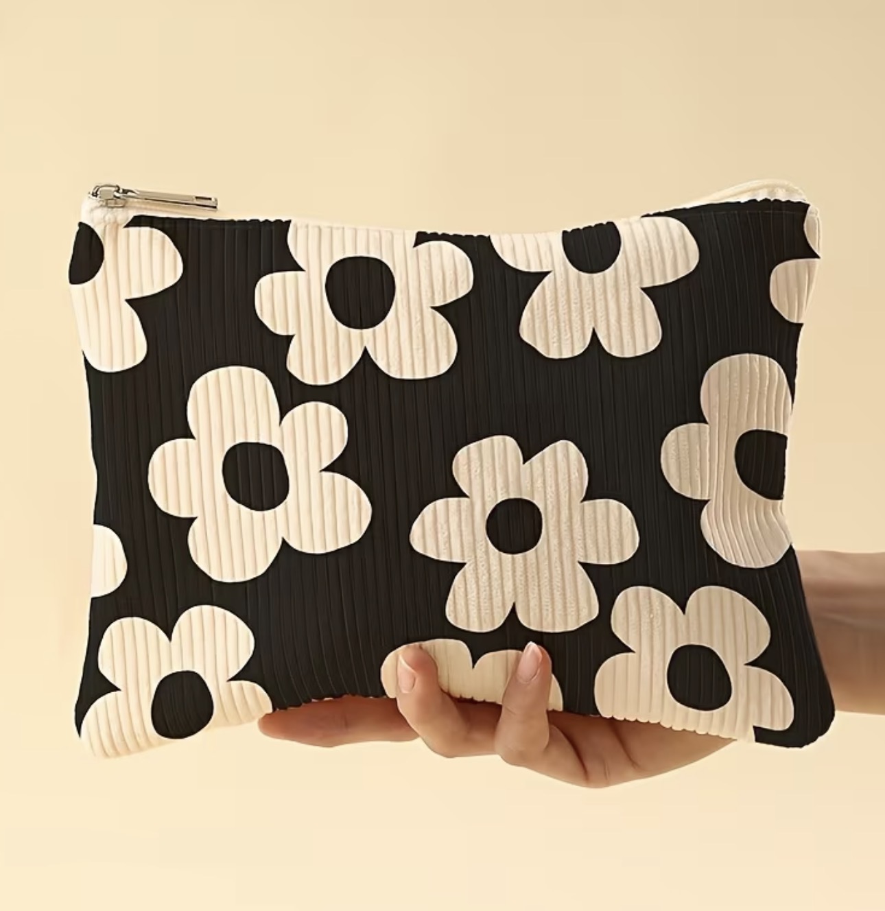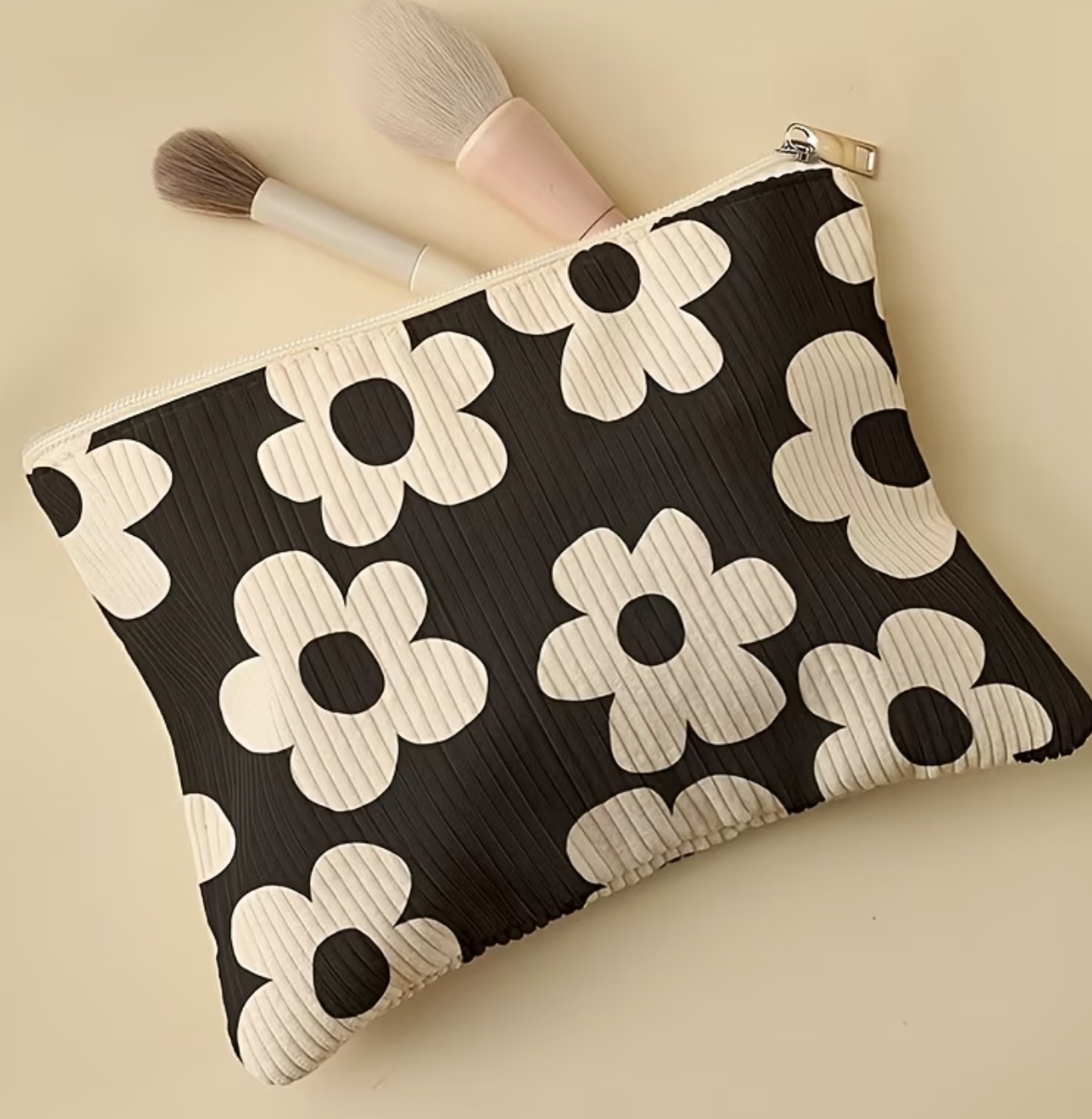 Black Background Small White Flower Pattern Printed Corduroy Tote Bag - Lightweight Zipper Lined Tote Storage Bag, Multifunctional Makeup Storage, Suitable for Both Men and Women.