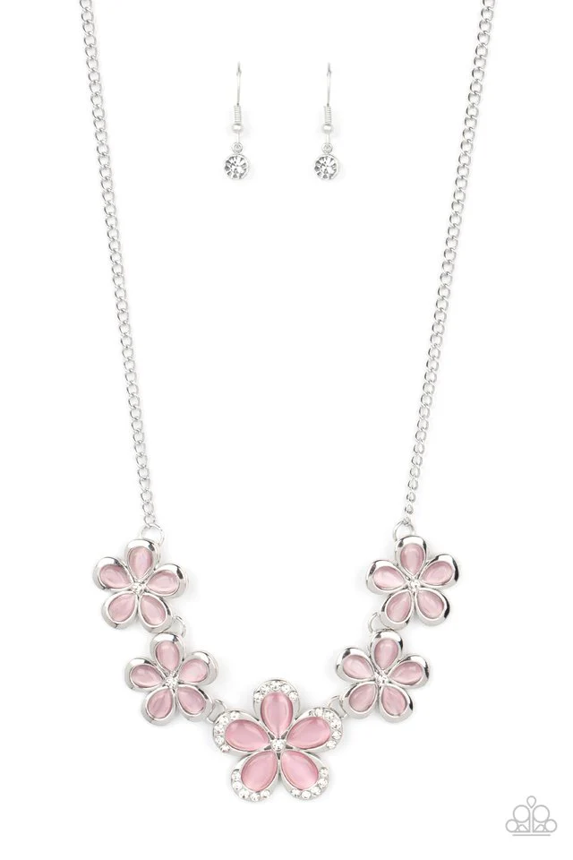 Bordered in silver accents, dainty pink cat's eye stone petals bloom from dainty white rhinestone centers, linking into ethereal blossoms below the collar. The centermost daisy is dotted in glassy white rhinestones, adding dazzling dimension to the floral fairytale. Features an adjustable clasp closure.