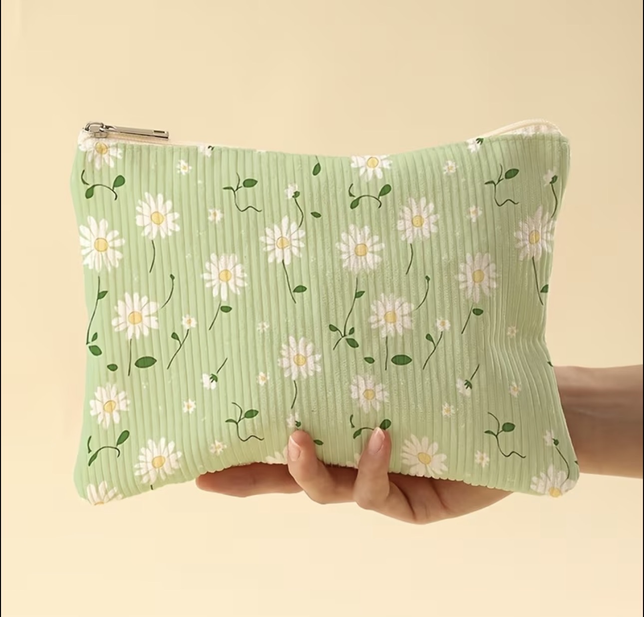 Green Daisy Pattern Makeup Bag - Large Capacity, Portable Makeup Storage Bag with Zipper Closure, Suitable for Men and Women, Suitable for Travel and Daily Use
