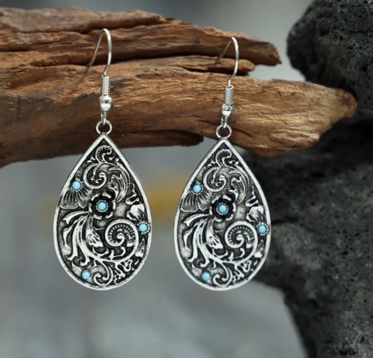 1 Pair Bohemian Western Style Carved Turquoise Inlaid Water Drop Pendant Earrings For Women
