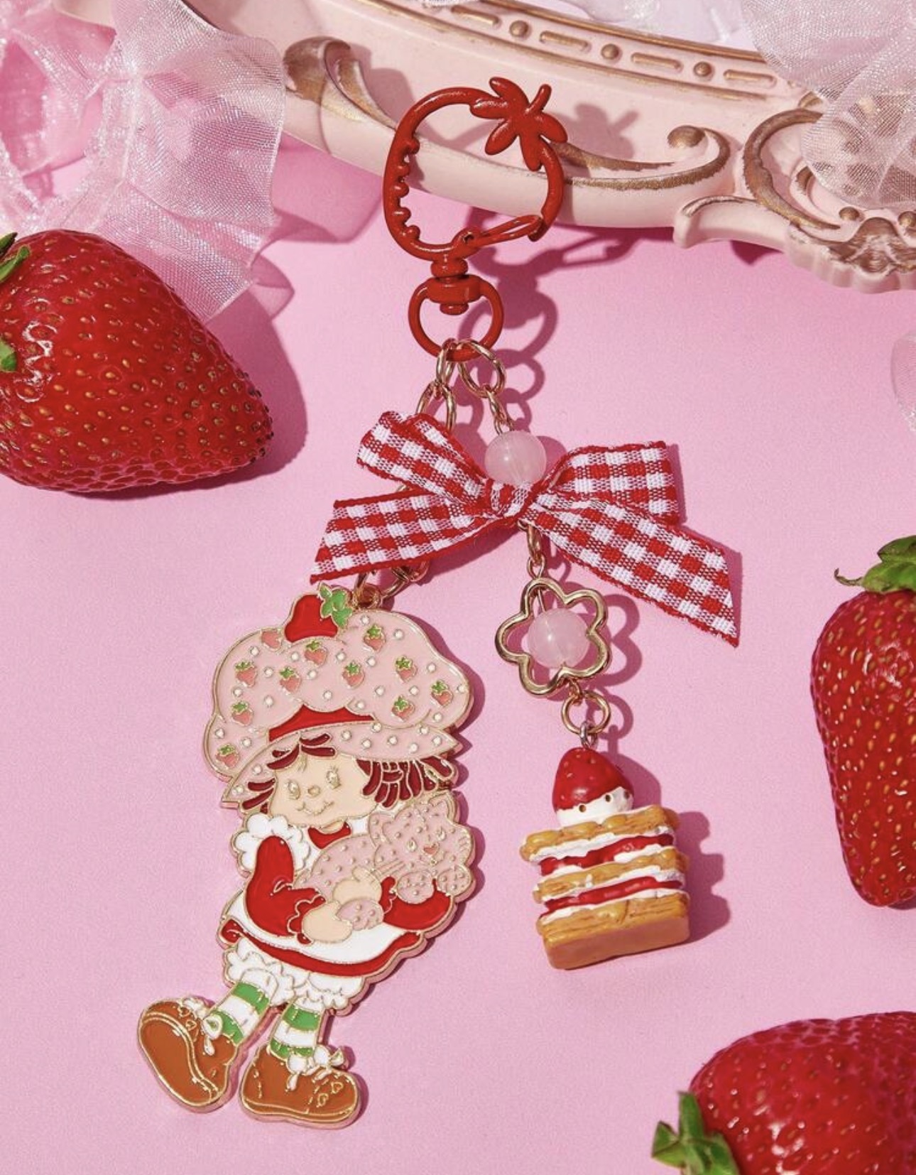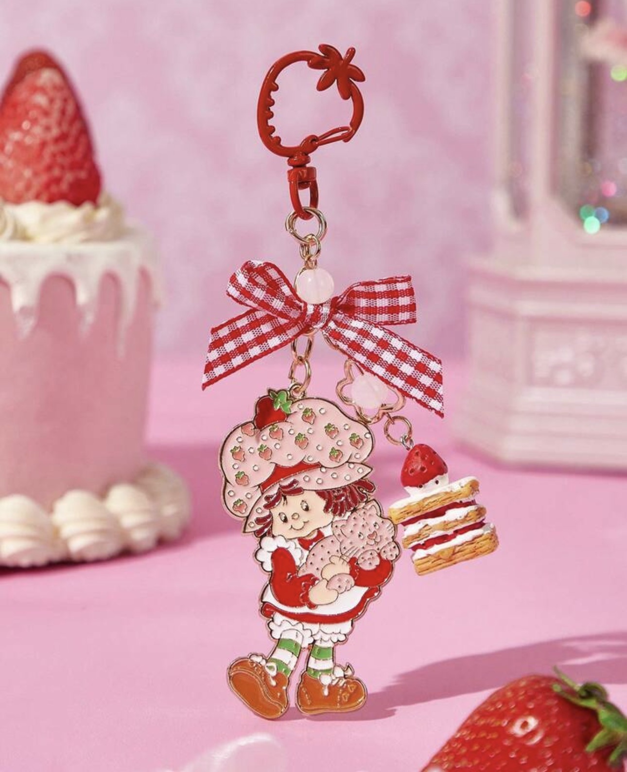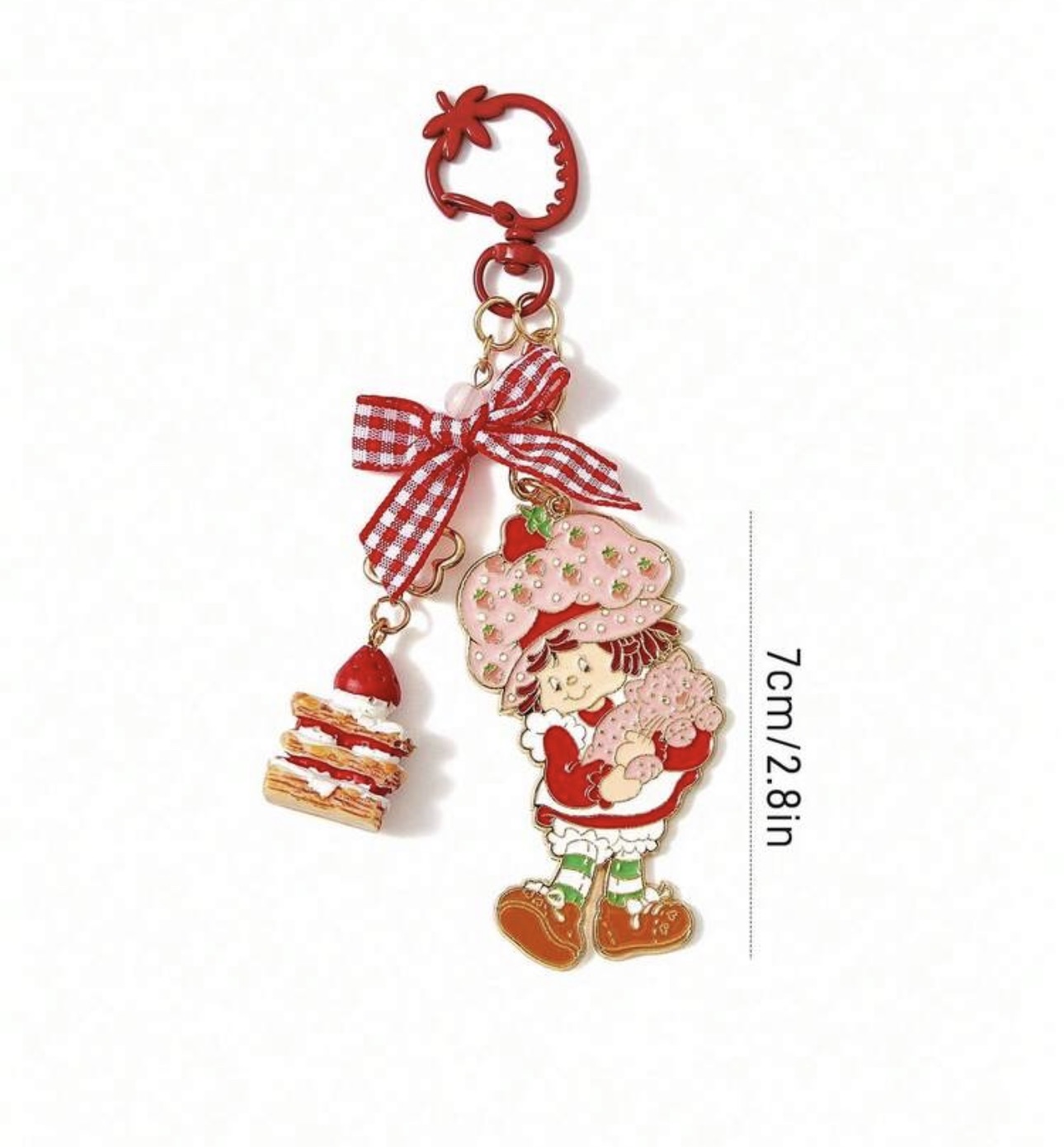 Strawberry Shortcake Fashionable & Sweet Cute Strawberry Cake Checkered Bow Zinc Alloy Keychain Bag Pendant Charm Commemorative Collection Gift Gold Keyring,Gift Ideas