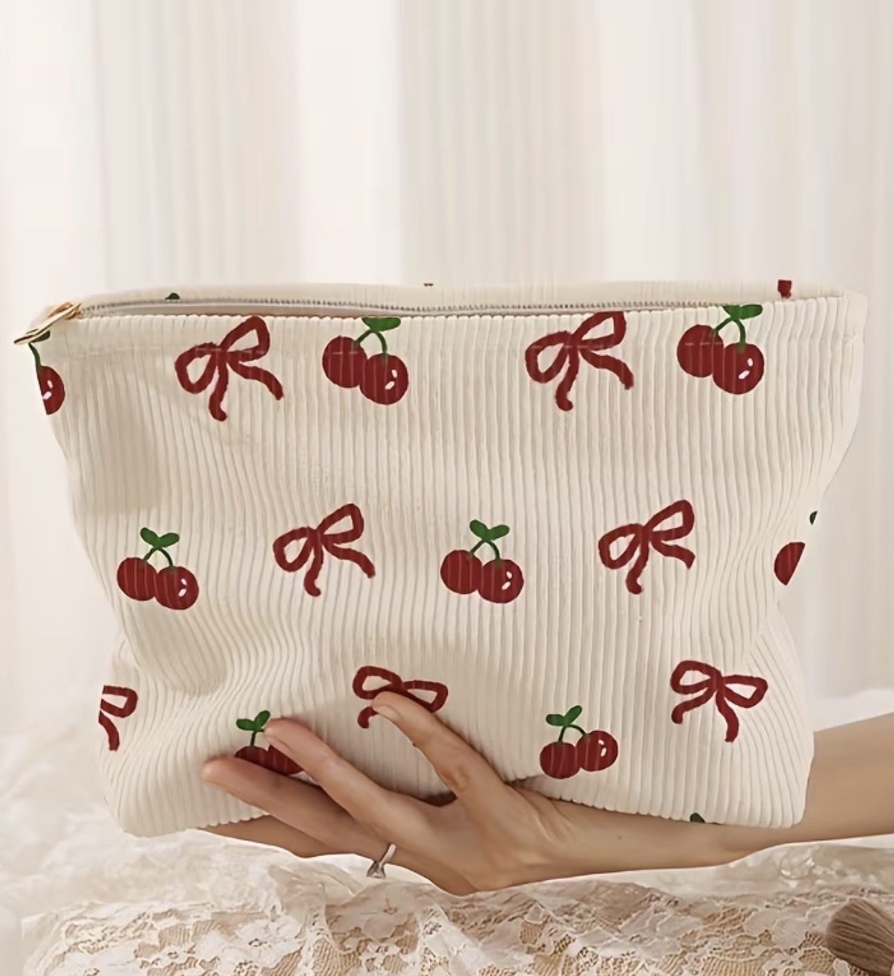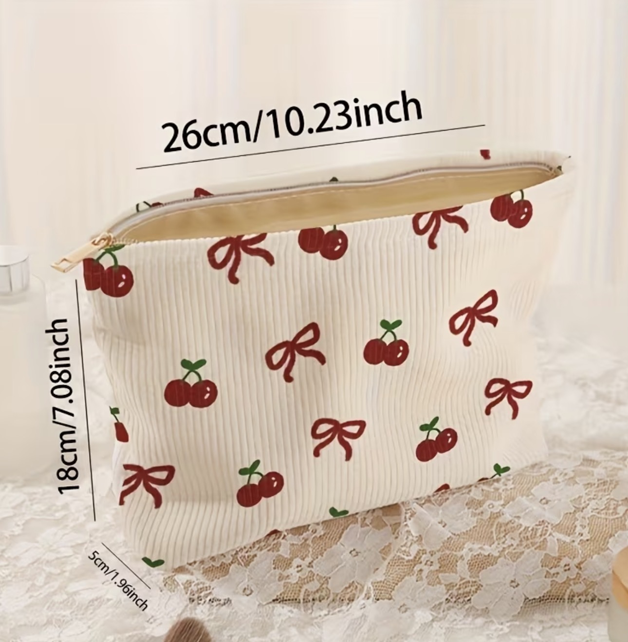 Chic Cherry Bow Print Corduroy Makeup Bag - Lightweight, Multi-Functional Cosmetic & Toiletry Organizer with Lining, Perfect for Travel