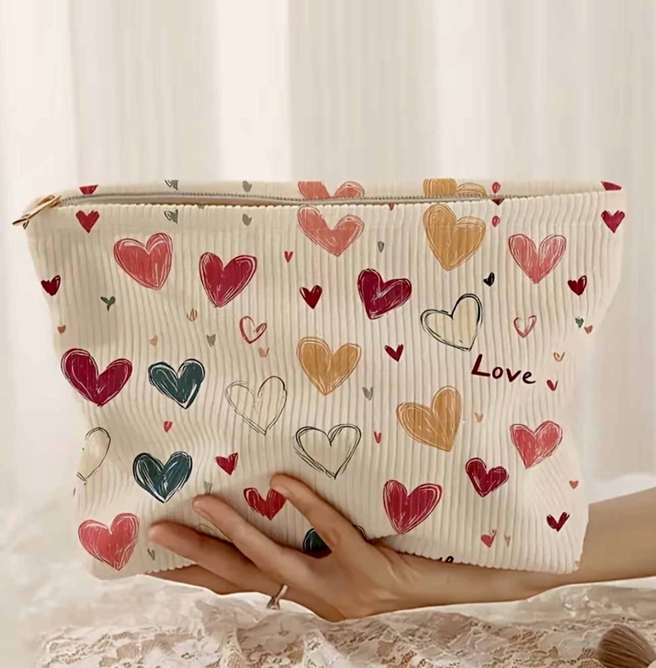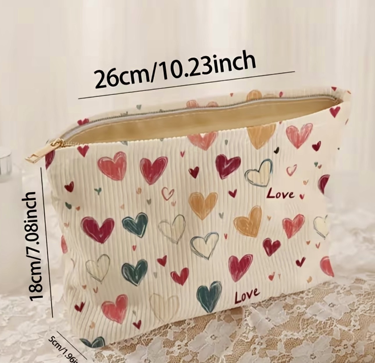 Cute Colorful Irregular Heart Pattern Printed Corduroy Zipper Pouch, Lightweight Makeup Bag Cosmetic Case, Multi-Functional Toiletry Organizer with Lining.