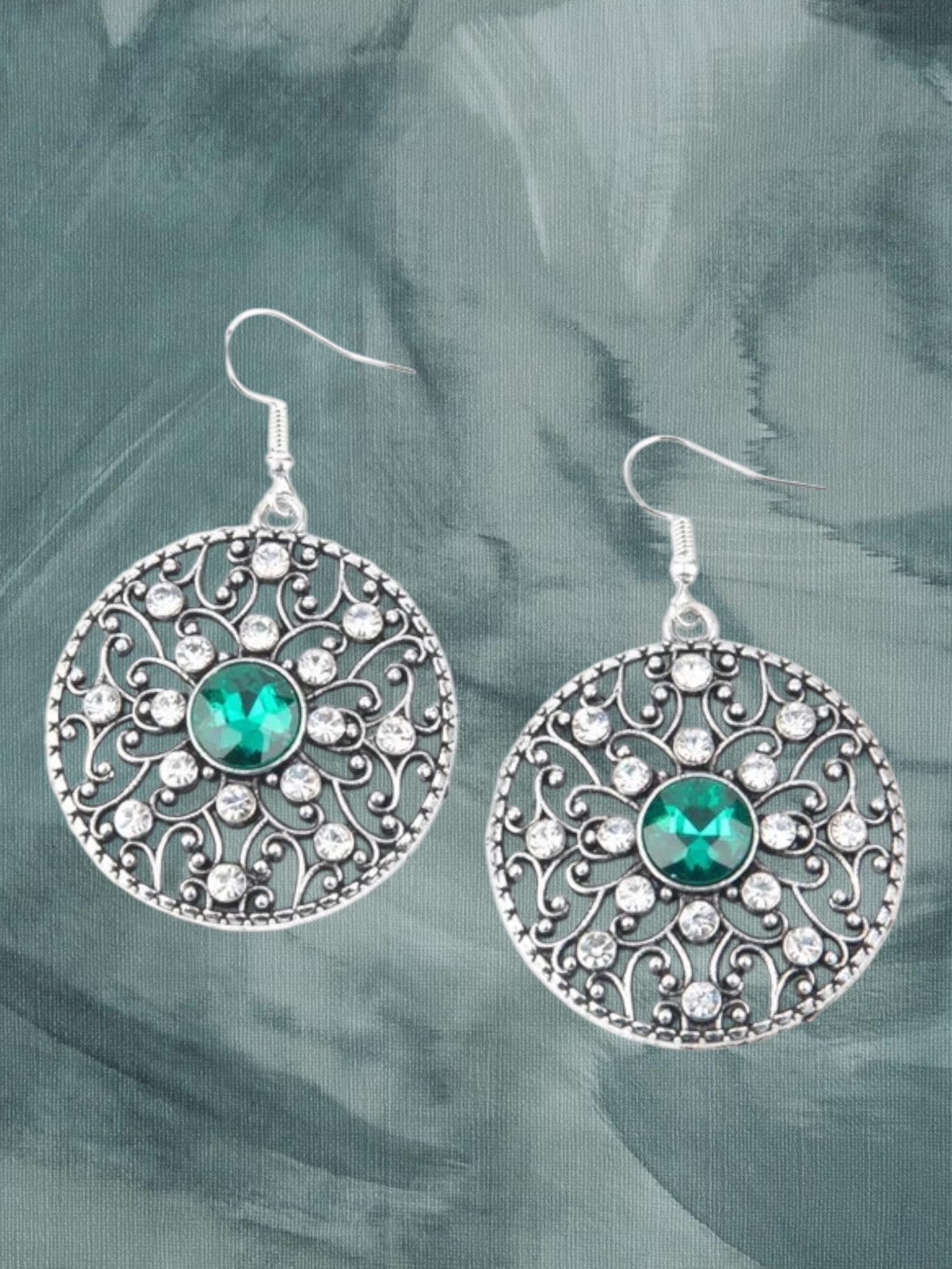 Dotted in glassy white rhinestones, a backdrop of studded silver vine-like filigree climbs a circular frame. An oversized green rhinestone embellishes the center for a whimsical finish. Earring attaches to a standard fishhook fitting.
