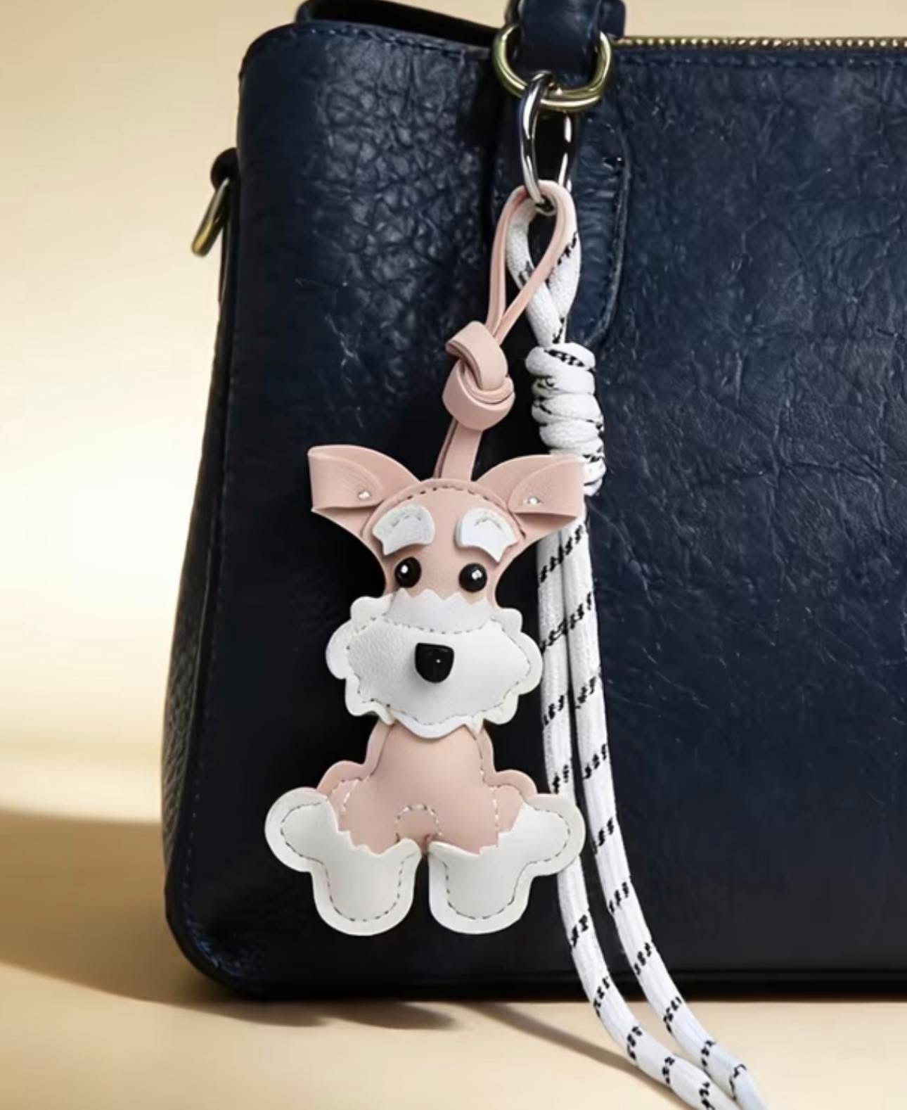 The item shown is a Schnauzer bag charm and keychain, typically crafted from PU or vegan leather. This decorative accessory is designed to be looped onto handbags, backpacks, or used to organize keys.