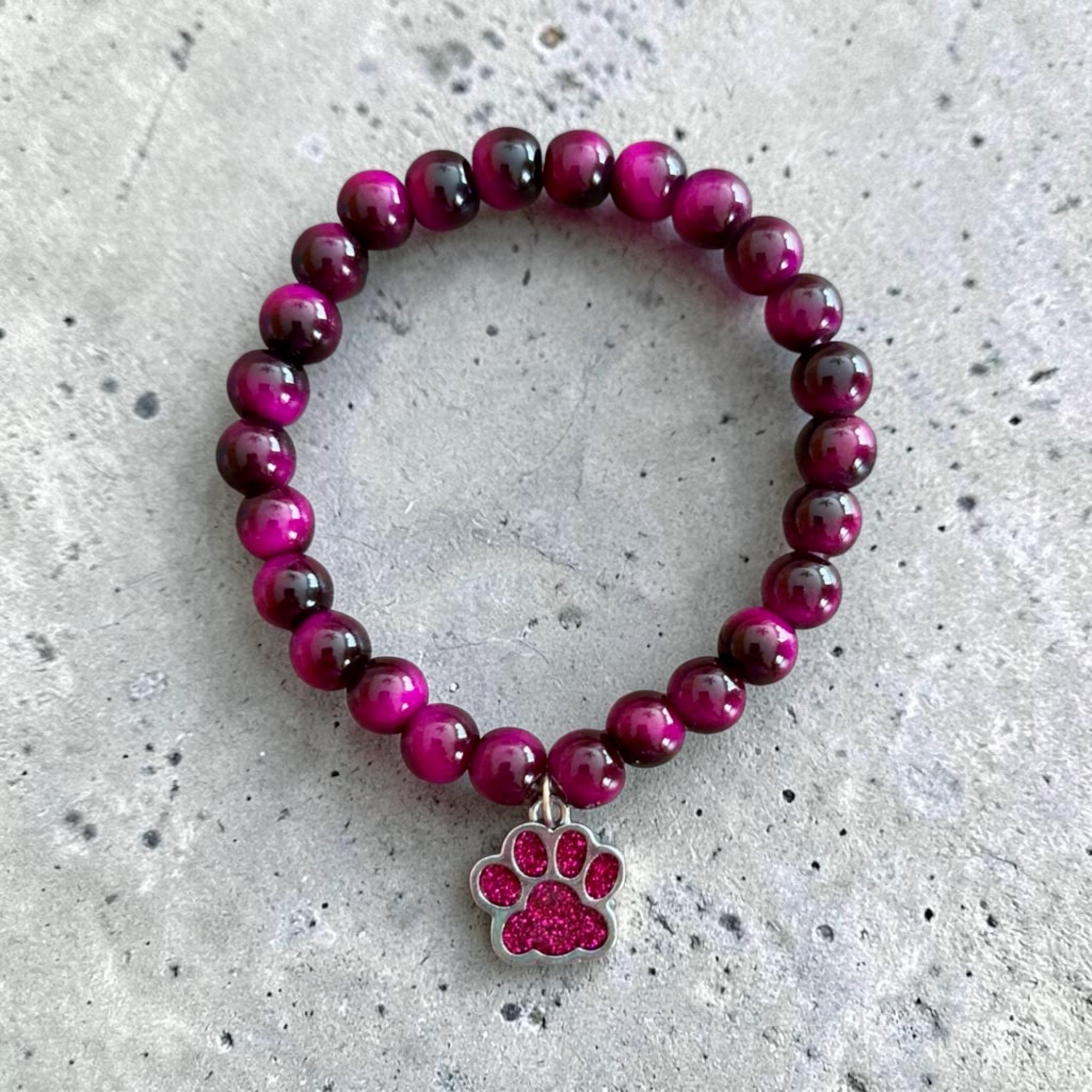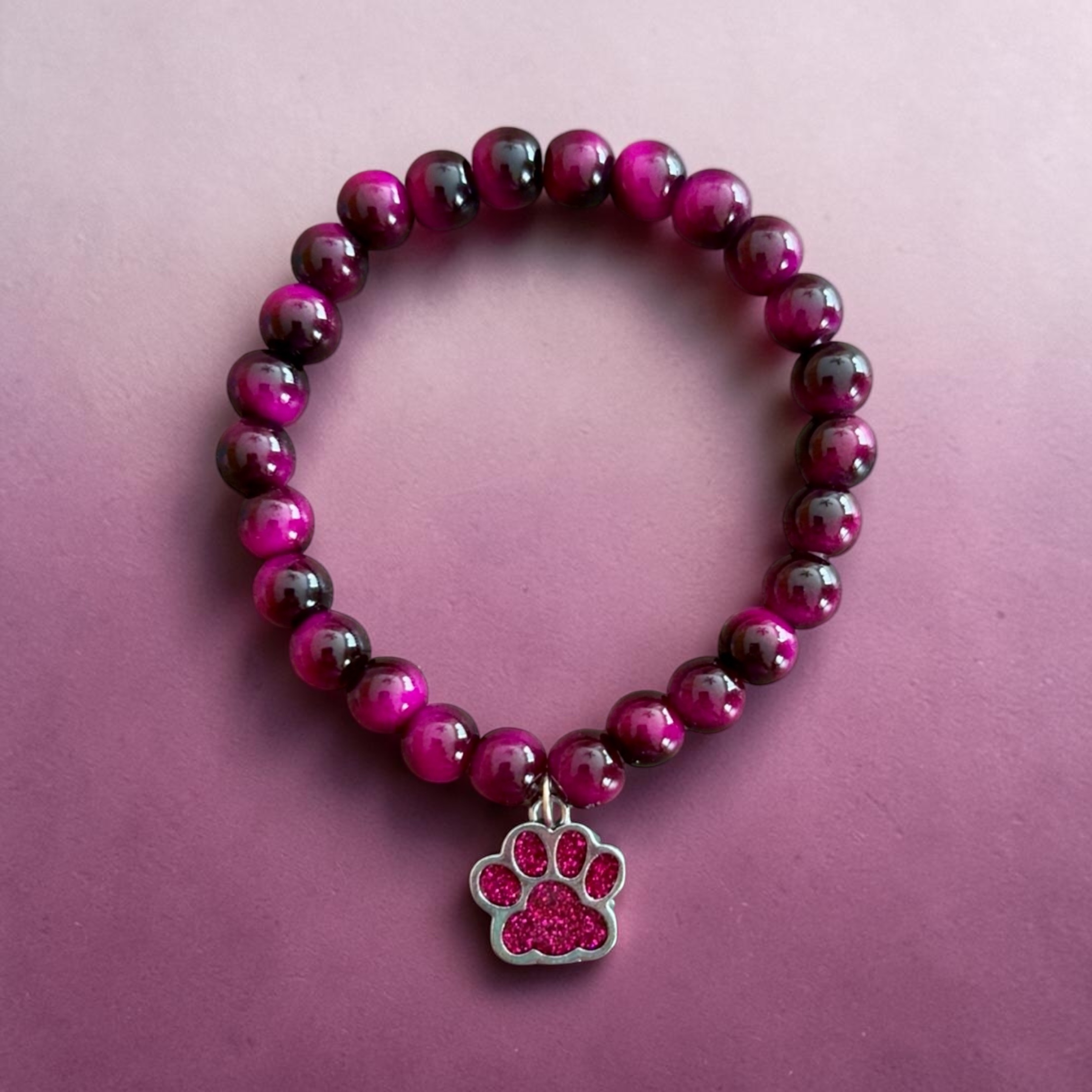 This beaded bracelet features vibrant, high-quality Pink Tiger's Eye gemstone beads, known for their unique silky luster and chatoyancy. The centerpiece is a detailed, silver-toned paw print charm filled with sparkly pink glitter, making it a popular choice as a "dog mom" gift or a memorial piece for a beloved pet.