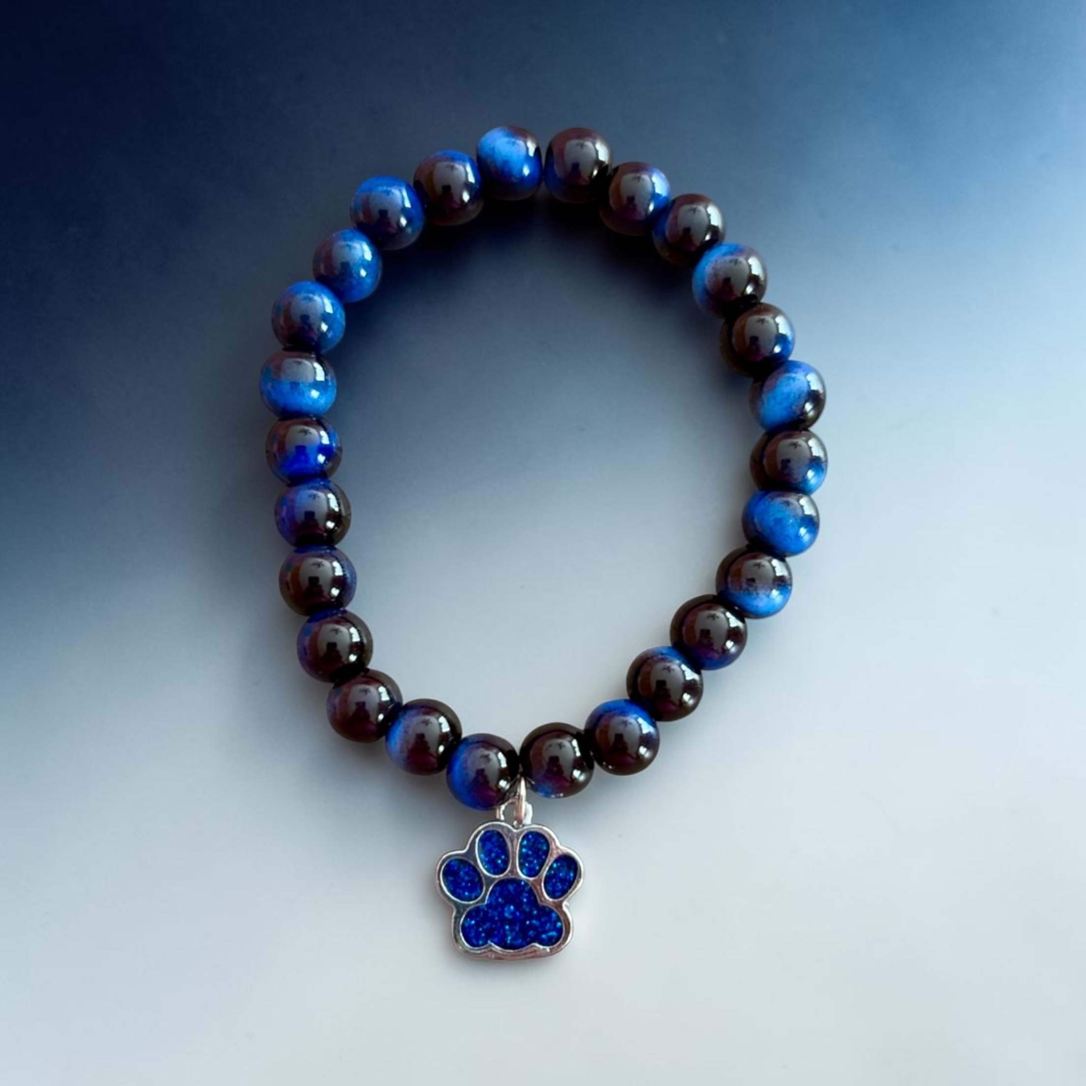 This bracelet features polished Blue Tiger's Eyegemstone beads, valued for their deep blue and black chatoyant shimmer. It is finished with a vibrant blue enameled paw print charm, often used in jewelry to symbolize a love for pets or animal rescue.