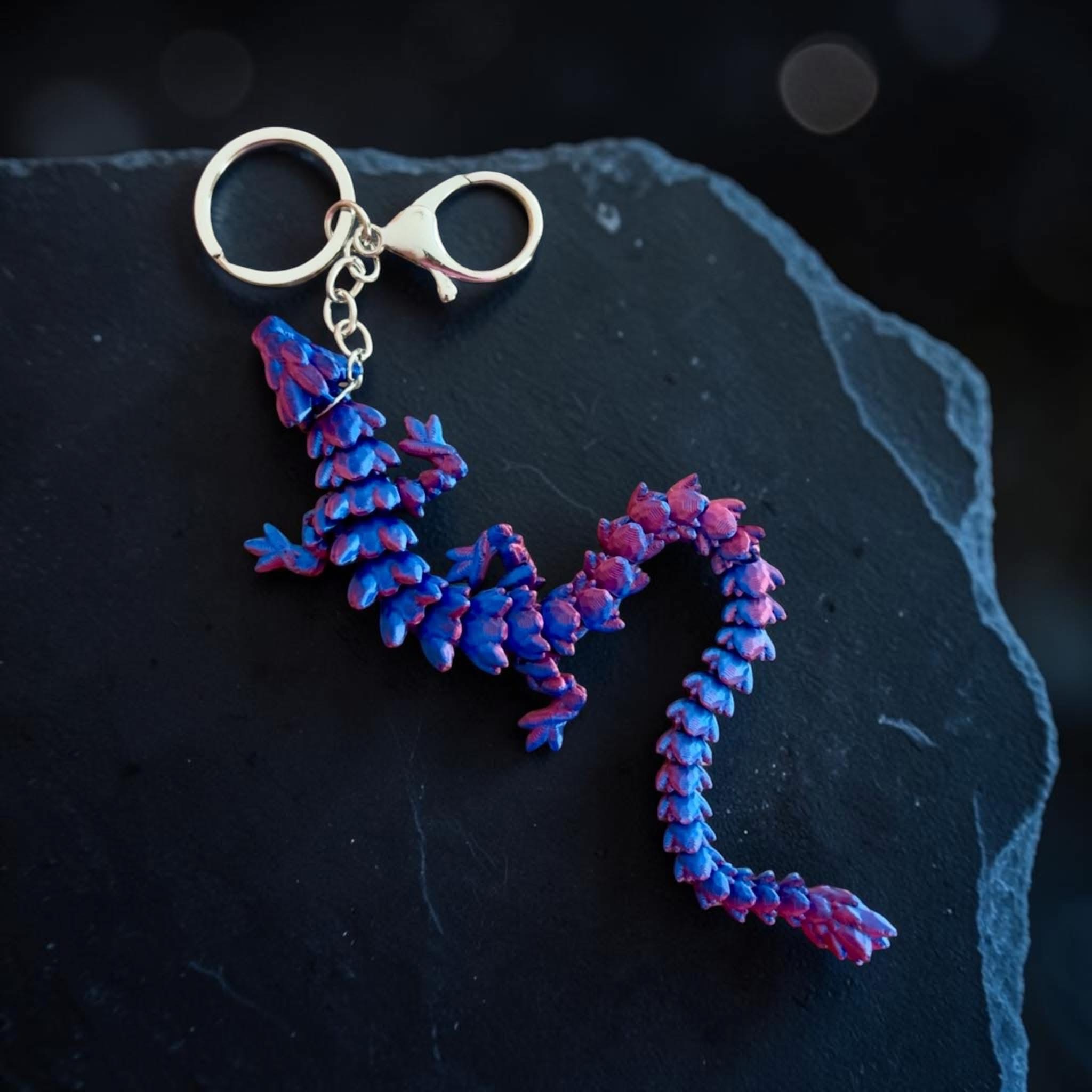 The item in the image is an Outlaw Dragon Keychain, which is a type of 3D-printed articulated fidget toy.