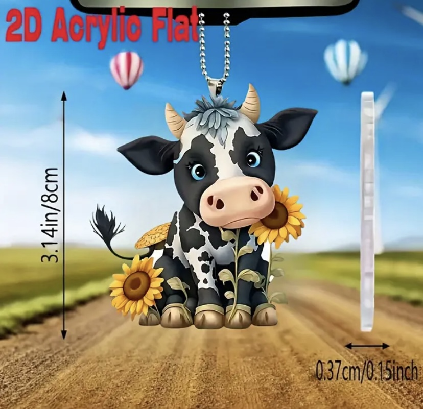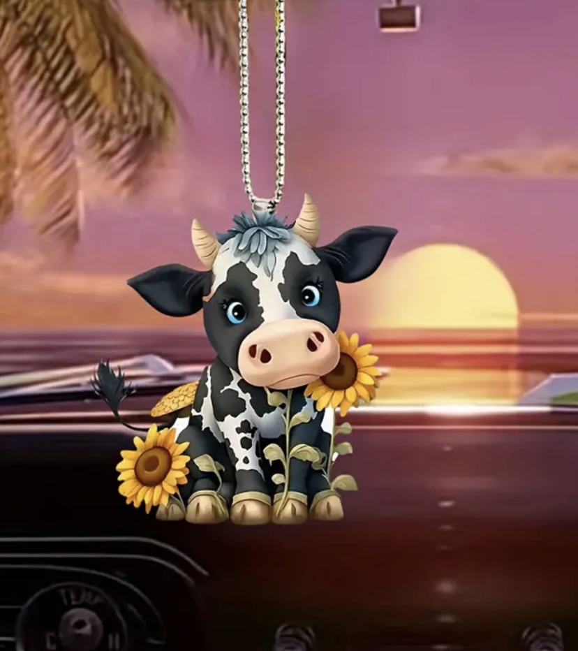 Sunflower Cow Pattern Acrylic Car Pendant, Cartoon Style Universal Holiday Decor, Hanging Atmosphere Decoration, Home Accessory, Keychain Charm, Backpack Ornament - 1pc
