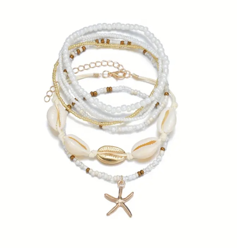 Set Of 7 Glass Rice Beads With Natural Seashell, Alloy Starfish Pendant Ankle Bracelet