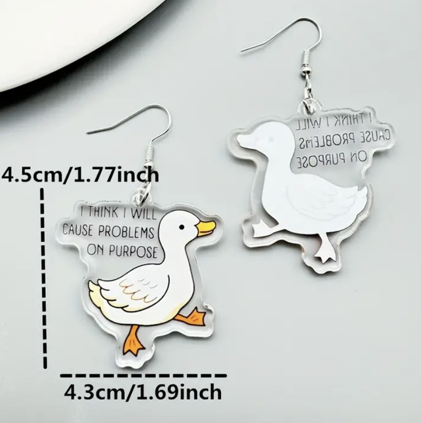 Whimsical Quote Dangle Earrings - Transparent Acrylic Duck Drops with Stainless Steel Ear Needles, Novelty Jewelry Gift for Women and Adults Over 15 Years Old, Fun Conversation Starter with Humorous Saying "I Think I Will Cause Problems on Purpose" - No Plating, Durable and Long-Lasting