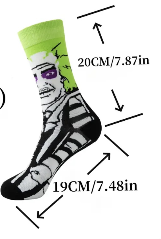 1 Pair of Fun Cartoon Beetle Juice Character Print Crew Socks - Breathable Polyester Knit Fabric with Spandex for Casual Comfortable Unisex Mid-Calf Length Outdoor Wear