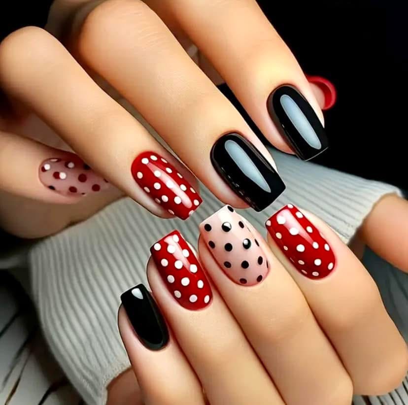 24pcs Durable Fake Nail Set - Medium Length, Glossy Finish, Polka Dot Pattern, Black & Red Series for Daily Wear