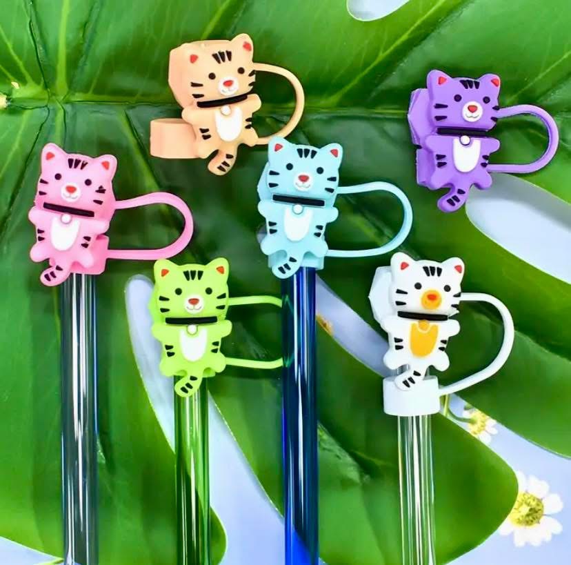 6pcs Cute Tiger & Cat Reusable Straw Toppers - Splashproof Plastic Animal-Themed Party Decorations, No Straws Included, Reusable Straw Covers | Cute Straw Decorations | Durable Straw Caps