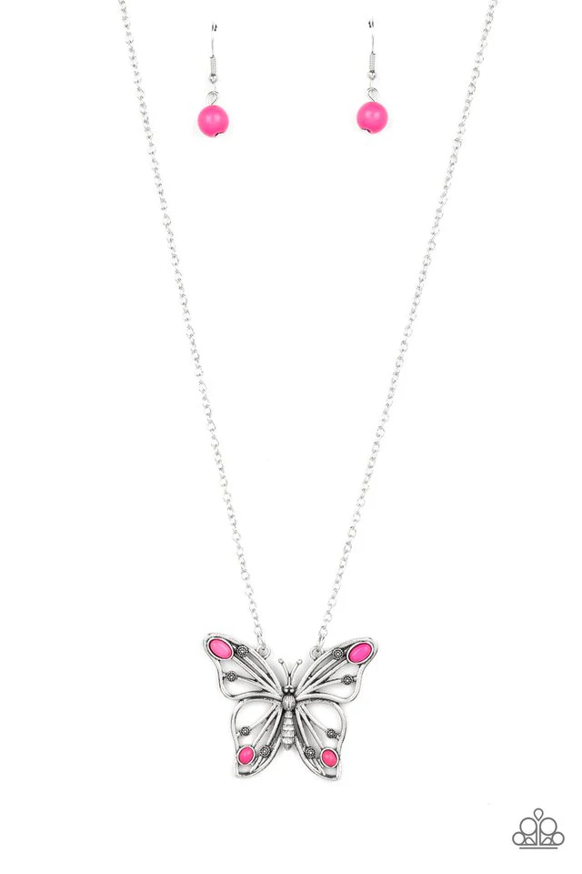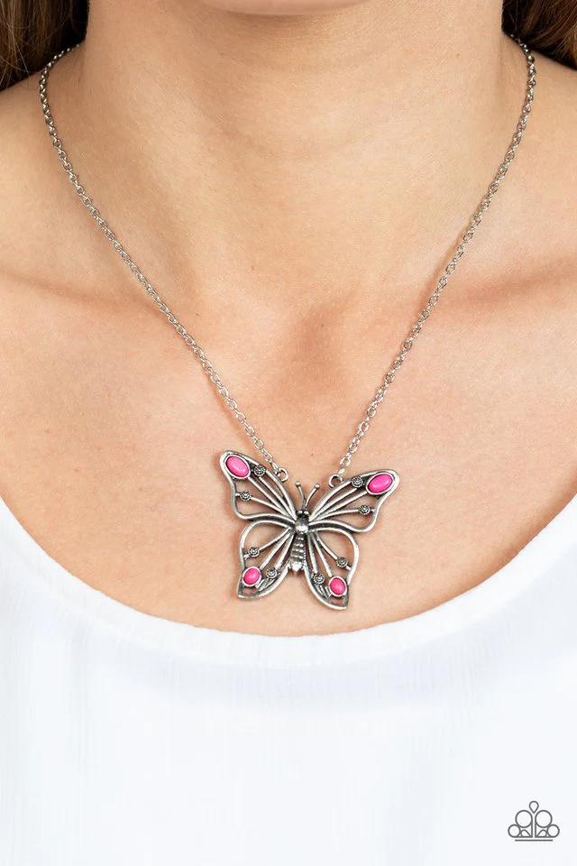 Accented in oval pink stones, a decorative silver butterfly flutters at the bottom of a lengthened silver chain for a free-spirited finish. Features an adjustable clasp closure.