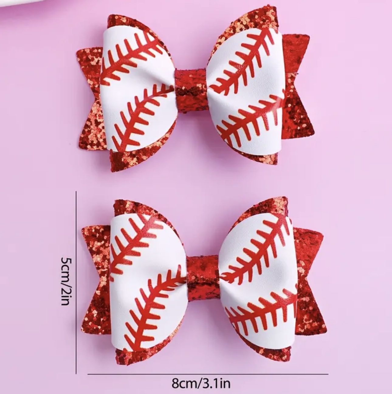 2pcs Adorable Baseball-Themed Bow Hair Clips for Girls - Red & White Glitter Design, Perfect for Cheerleaders, Fans, and Sports Accessories, Polyester Material, Ideal for Hairstyling, Hair Accessories for Girls
