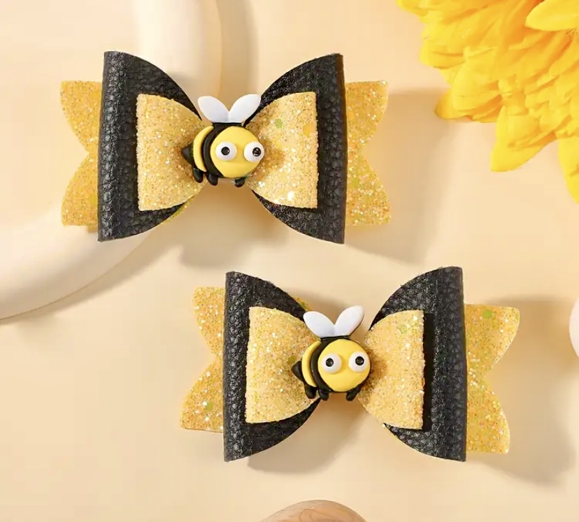 2 Cute Yellow Bee Accessories Bow Tie Bee Hair Clip Printed Fabric Girl Ponytail Pair Clips Holiday Dance Academy Party Style Girls Teenage Hairstyle Hardworking Little Bee Back-to-School Season Hair Accessory