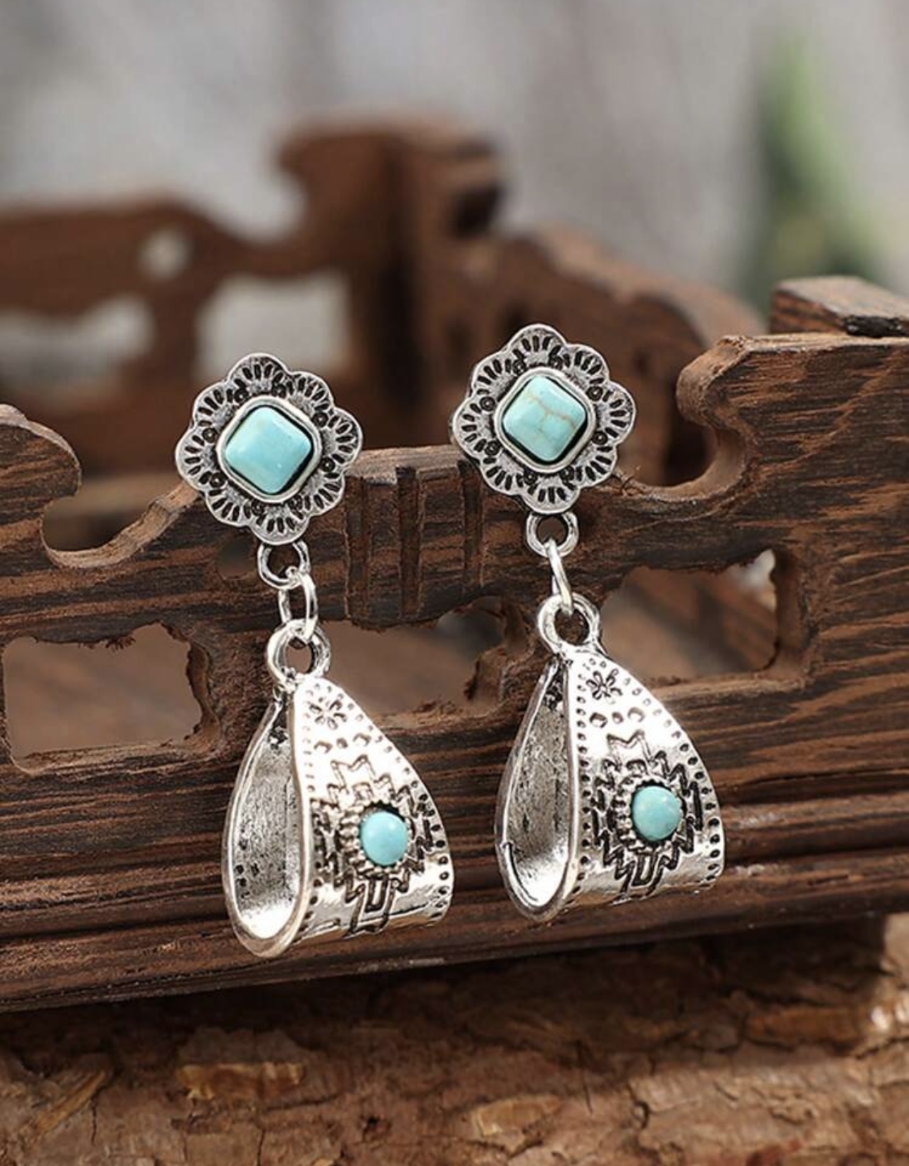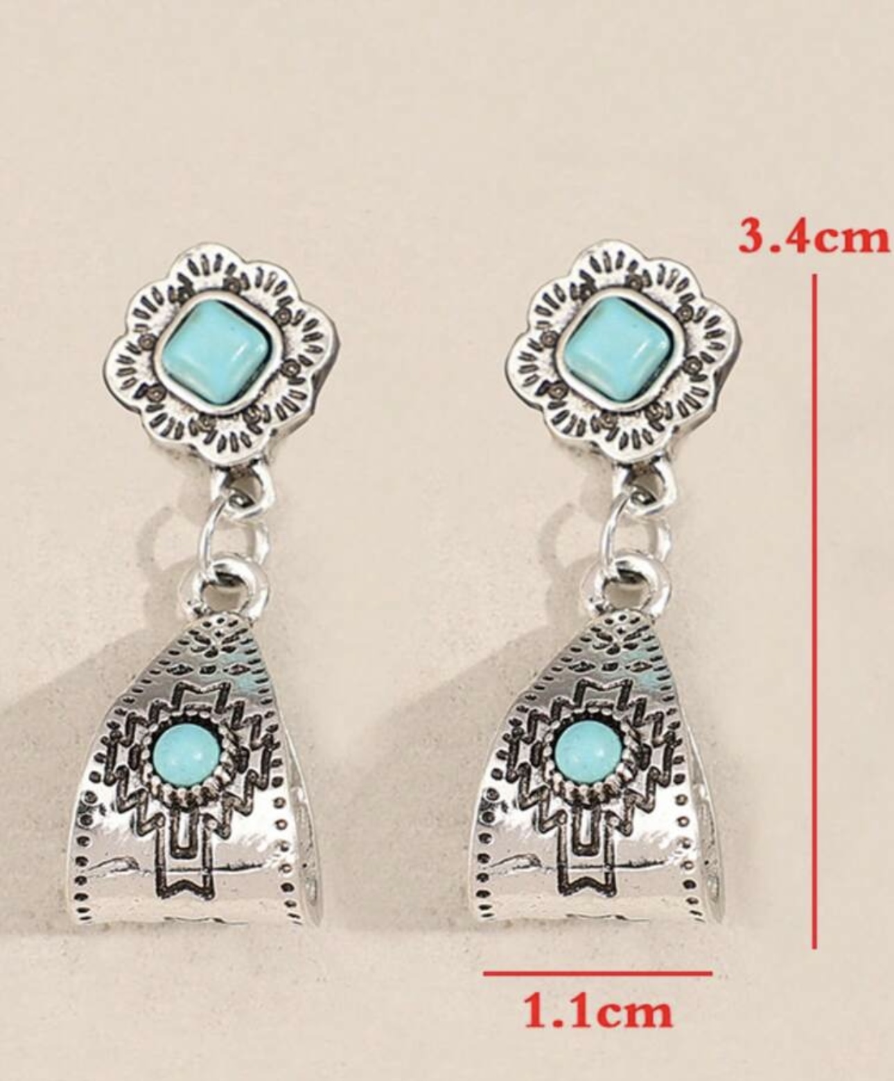 1 Pair Vintage Boho Western Style Carved Green Turquoise Inlaid Earrings, Women Retro Fashion Jewelry Gift