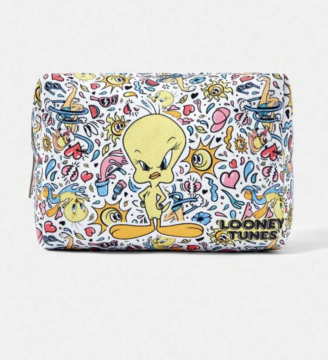1pc LOONEY TUNES Cartoon Applique Quilted Cosmetic Bag, Portable Makeup Storage Pouch With Zipper, Multi-Functional Organizer Bag, Lightweight Travel Bag For Men & Women