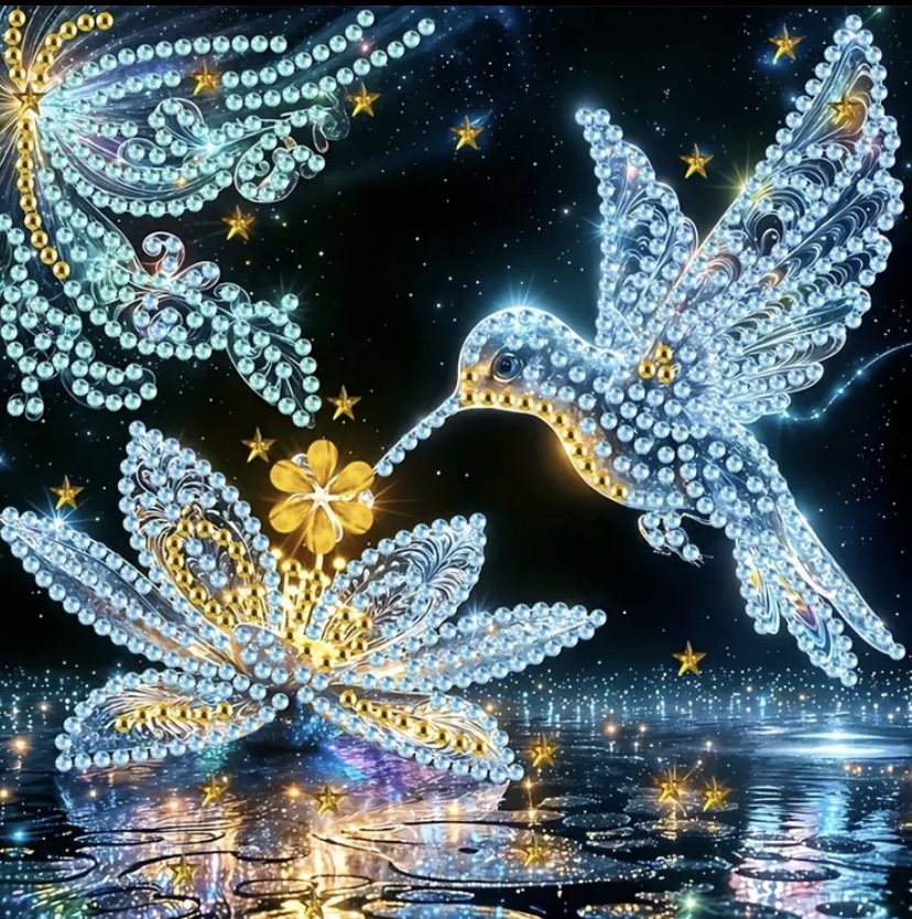 Hummingbird and Flowers Under the Starry Sky 5D Diamond Painting Kit - Special Shape Crystal Rhinestone Art, Perfect for Beginners, Home Wall Decor Gift
