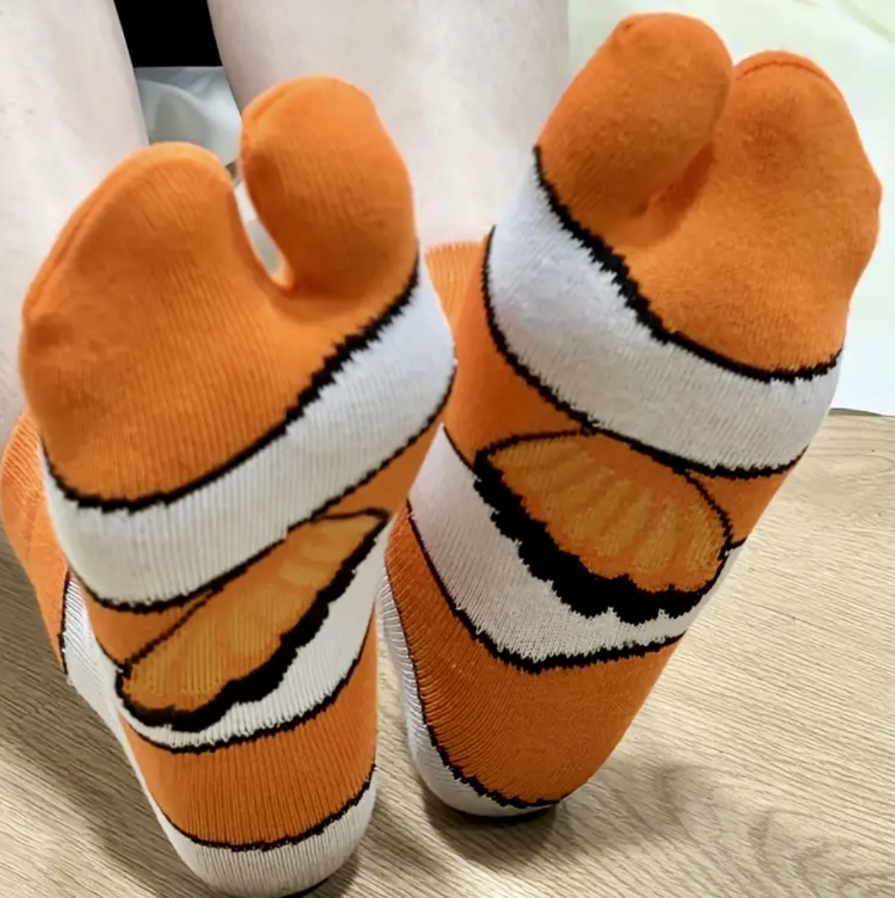 1 Pair Cartoon Clownfish Multifunctional Comfortable Split Toe Socks, 100% Polyester Knit Fabric, Hand Washable - Fun Orange Fashion Design