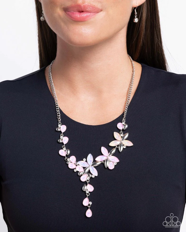 Adorn yourself with a captivating silver chain, embellished with a stunning array of opalescent marquise-cut rhinestones in luscious peach, pink, and purple hues. Silver petals gracefully emerge, creating a delicate floral motif. Interspersed white rhinestones nestled in silver fittings add a touch of sparkle, while an adjustable clasp closure ensures a perfect fit for any occasion.