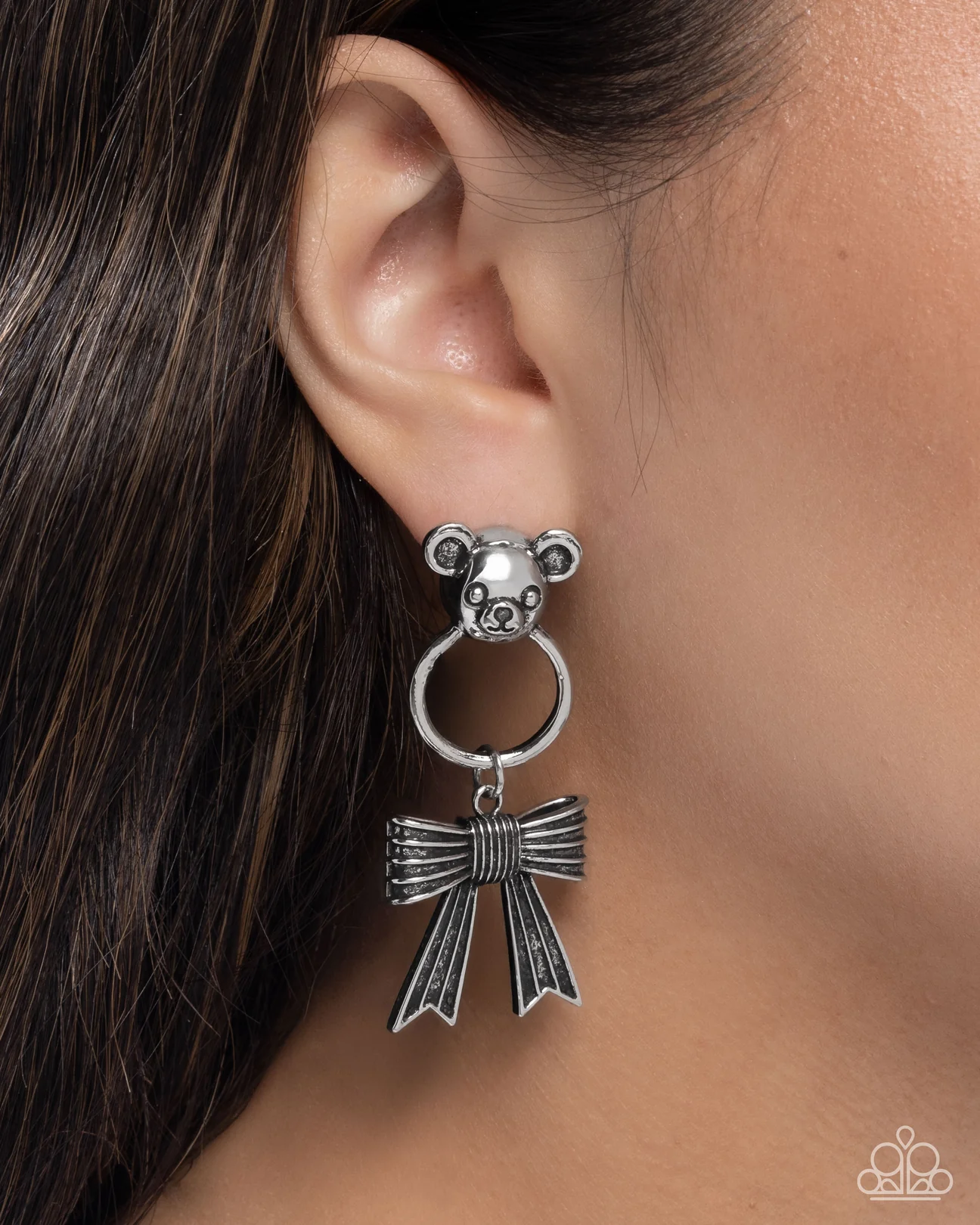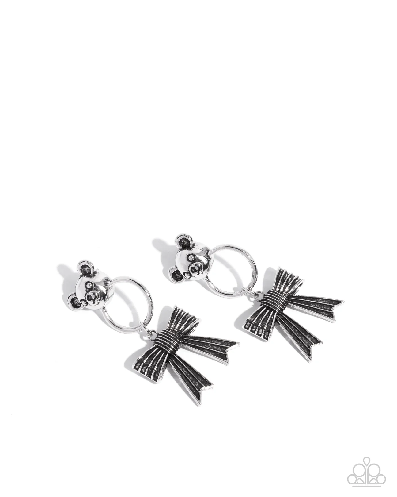 A detailed silver teddy bear head glistens atop the ear giving way to a glistening silver ring for a cuddly chic display. A highly textured silver reflective bow glides along the silver ring for a sophisticated swaying finish. Earring attaches to a standard post fitting.