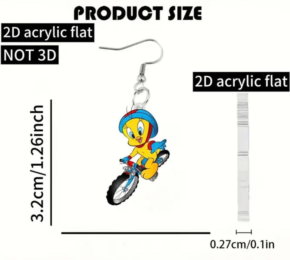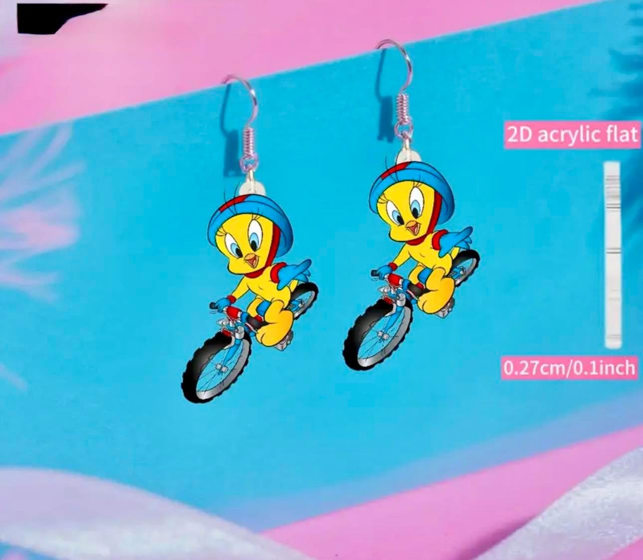 2D Flat - Pair, 2025 New 2D Acrylic Pendant Earrings, Disney Little Yellow Duck Riding Mountain Bike, Cute Novelty Fashionable Earrings, Women'S Earrings Decoration, Holiday Party Small Gift, Without Battery