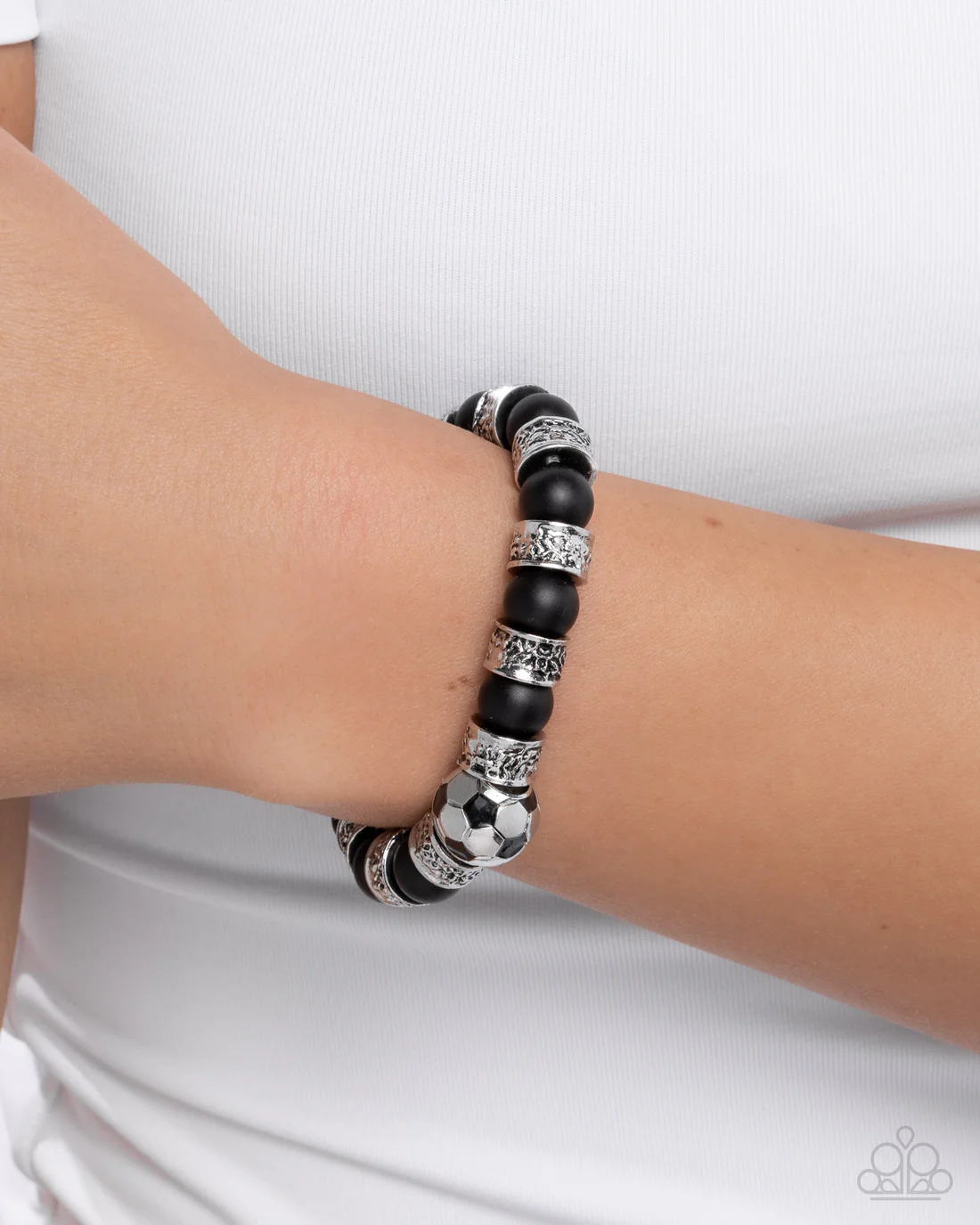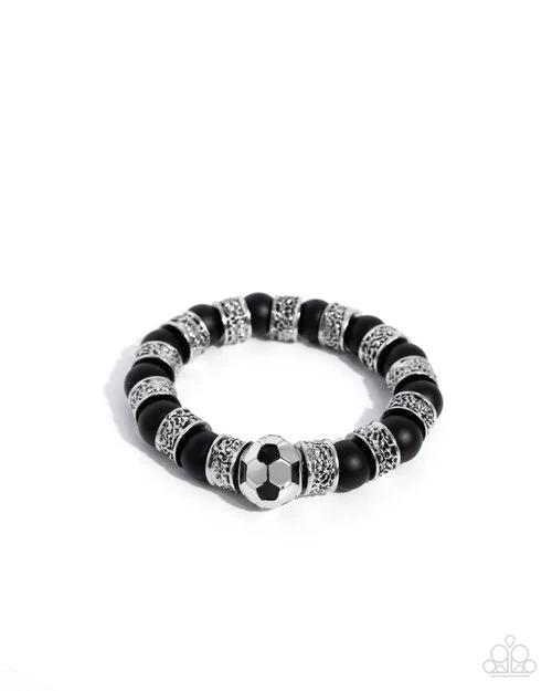 Infused along an elastic stretchy band, a collection of black matte beads and silver embellished discs alternate along the wrist, leading the eye to a soccer ball charm at its center for a sporty chic display.