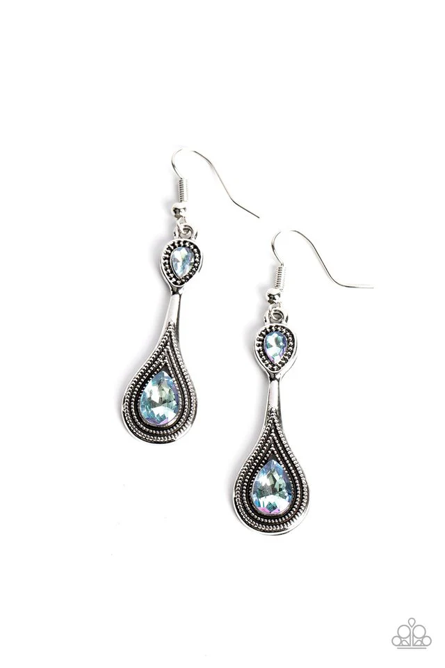 Two iridescent blue rhinestones adorn the top and bottom of an extended silver lure radiating with studded textures, resulting in an ethereal dazzle. Earring attaches to a standard fishhook fitting. Due to its prismatic palette, color may vary.