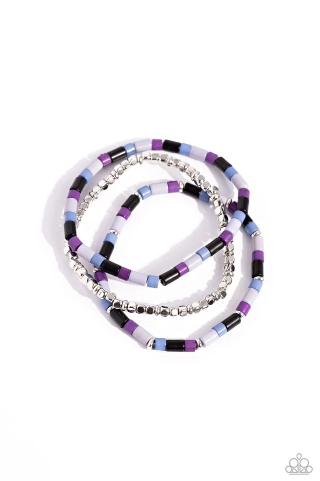 stunning array of natural beauty, this bracelet features black, purple, blue, and gray cylindrical stone beads artfully scattered with silveraccents. These vibrant stones interlace with a shimmering strand of silver cube beads on flexible bands, effortlessly forming layered elegance around the wrist, perfect for adding a touch of sophistication to any outfit.