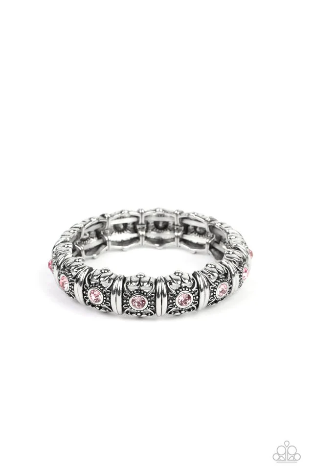 Centered around silver intricate, floral casings, pink rhinestones glimmer along threaded stretchy bands around the wrist for an ageless look.