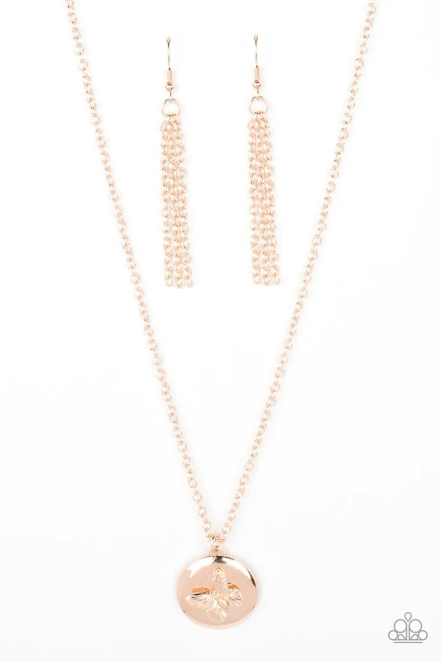 A dainty rose gold butterfly flutters atop a beveled rose gold disc, resulting in a whimsical pendant at the bottom of a classic rose gold chain. Features an adjustable clasp closure.
