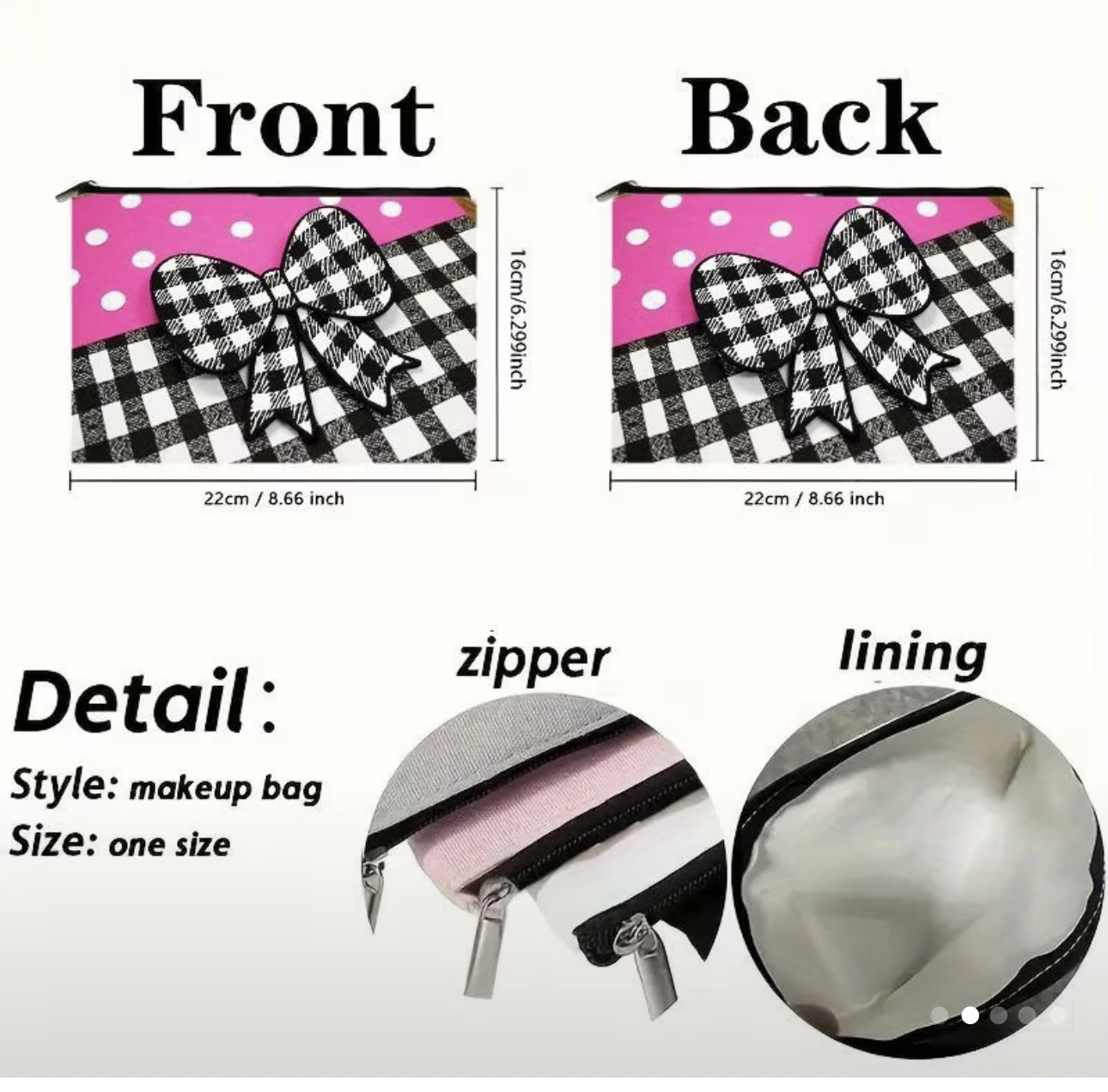 Stylish 2D Flat Design Makeup Pouch Featuring a Pink Polka Dot Top, a Black And White Gingham Bow Detail, And a Coordinating Gingham Base - Lightweight, Color-Resistant, And Foldable, Perfect for Organizing Cosmetics for Women