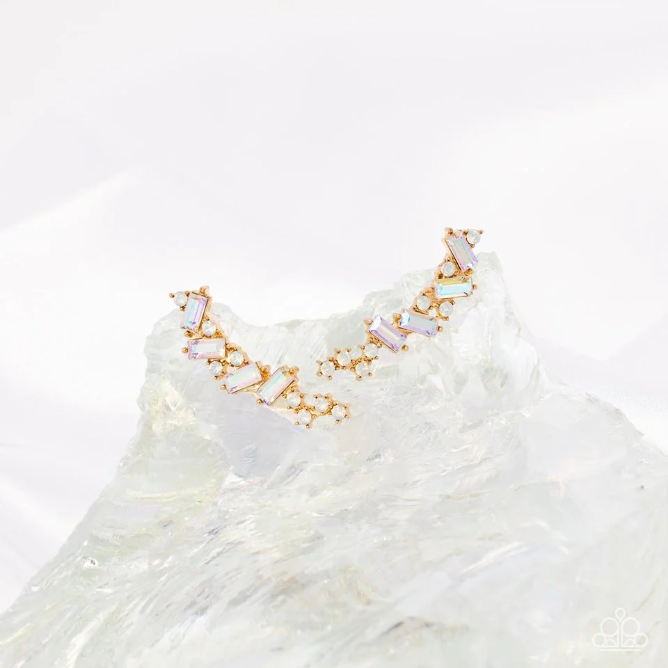 A golden path of dainty opal rhinestones, interrupted by iridescent emerald cut rhinestones, gently climbs the ear, creating a magical effect. Features an extended post fitting that climbs the back of the ear and can be pressed together for a more secure fit.